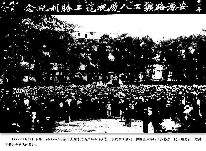 1922年9月18日下午,安源路礦萬余名工人在半邊街廣場召開大會,慶祝罷工勝利,并在會后舉行了聲勢浩大的示威活動。圖為慶祝大會盛況。