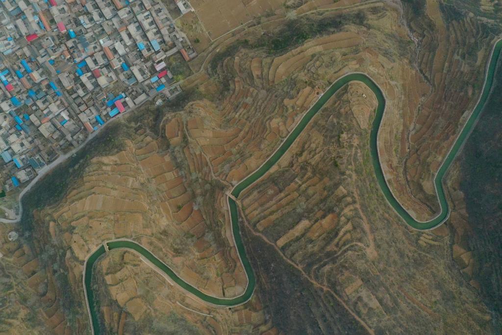 在河南省林州市任村鎮陽耳莊村拍攝的紅旗渠總干渠(2025年3月25日攝,無人機照片)。新華社記者 郝源 攝