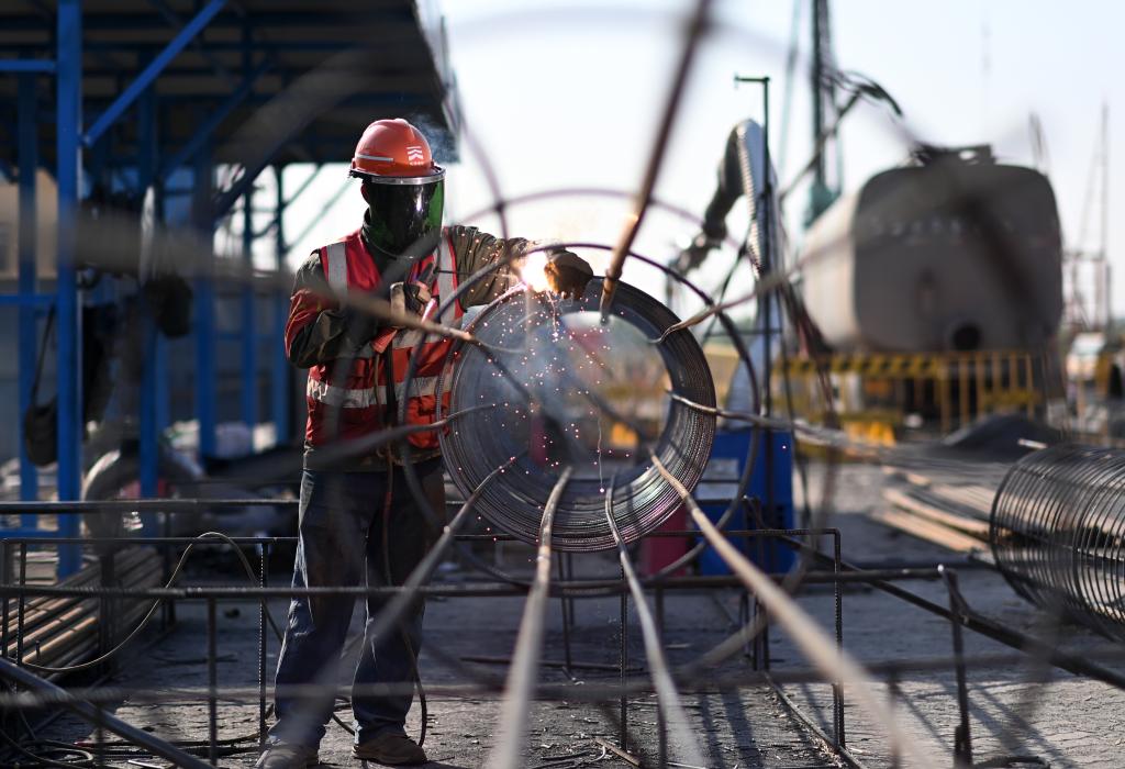 4月25日,工人在天津港第一港埠有限公司散糧三期新建筒倉工程建設現場施工。新華社記者 趙子碩 攝