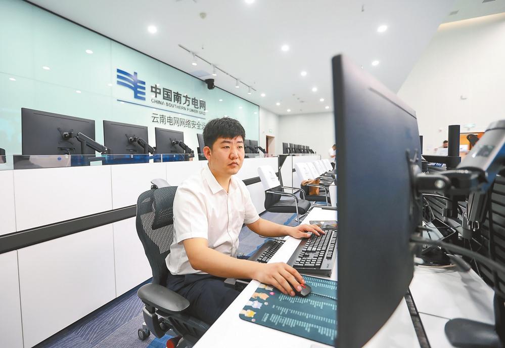 南方電網云南信息中心運行調度控制中心,肖鵬緊盯電腦屏幕,手指飛速敲打鍵盤,調出防御系統后臺代碼,插入指令。監控大屏上,代表攻擊源的紅點被一一攔截,消失在數字防線外……這些猶如科幻電影中的場景,卻是南方電網云南信息中心運行調度控制中心副經理、工程師肖鵬的日常工作。