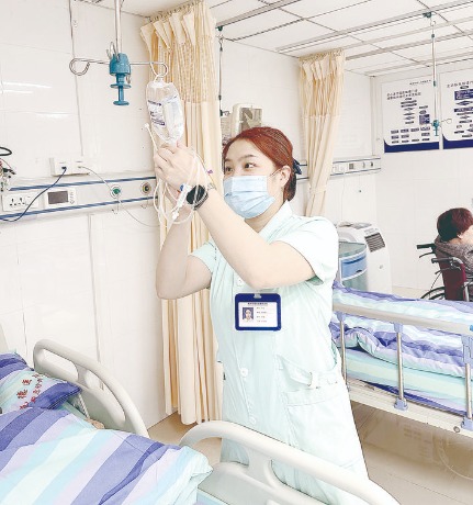 朱姣幫病人換吊瓶。受訪者供圖
