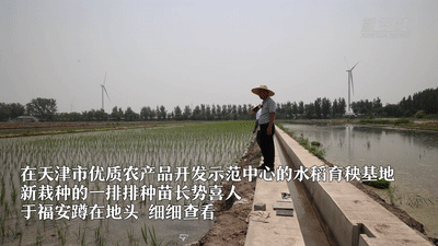 在天津市優質農產品開發示范中心的水稻育秧基地,新栽種的一排排種苗長勢喜人。于福安蹲在地頭,細細查看。