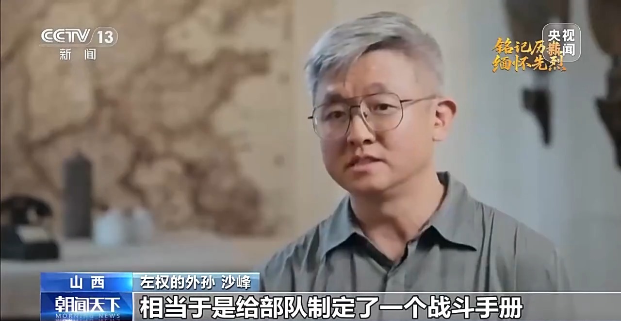 左權(quán)的外孫 沙峰:總結(jié)出了我們?cè)谔猩絽^(qū)進(jìn)行敵后游擊戰(zhàn)的戰(zhàn)斗方式,有埋伏戰(zhàn)、有突襲戰(zhàn),部隊(duì)?wèi)?yīng)該怎么打,相當(dāng)于是給部隊(duì)制定了一個(gè)戰(zhàn)斗手冊(cè),大家可以遵照去執(zhí)行,去學(xué)習(xí)。