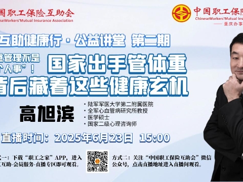 直播回顧|“互助健康行·公益講堂”2025年第二期——體重管理不是“個人事”!國家出手管體重,背后藏著這些健康玄機??????6月23日(周一)下午15:00至16:30,由中國職工保險互助會主辦、中互會重慶辦事處承辦的2025年第二期“互助健康行?公益講堂”——《體重管理不是“個人事”!國家出手管體重,背后藏著健康玄機》,開啟線上直播。本期“互助健康行·公益講堂”線上直播活動邀請陸軍軍醫大學第二附屬醫院(新橋醫院)全軍心血管病研究所教授、醫學碩士、執業醫師、國家二級心理咨詢師、重慶醫學會醫師學會神經內科專委會睡眠學組委員、重慶市心理健康學會理事、重慶市心理健康學會綜合醫院會診專委會副主委、重慶醫師協會基層醫務工作者分會副會長兼心理健康學組組長、身心健康管理專家高旭濱教授,和職工會員們聊一聊體重管理對家庭、社會的重要影響,以及肥胖者的心理狀態和體重超重的重要原因。