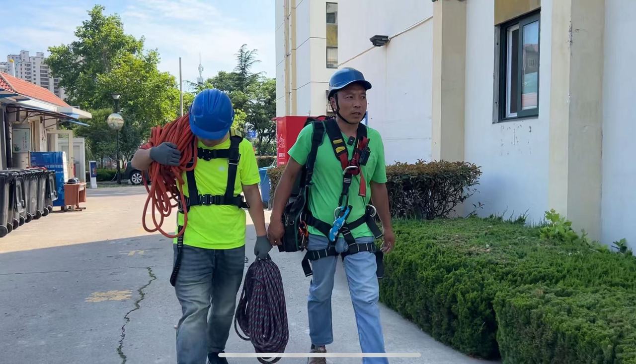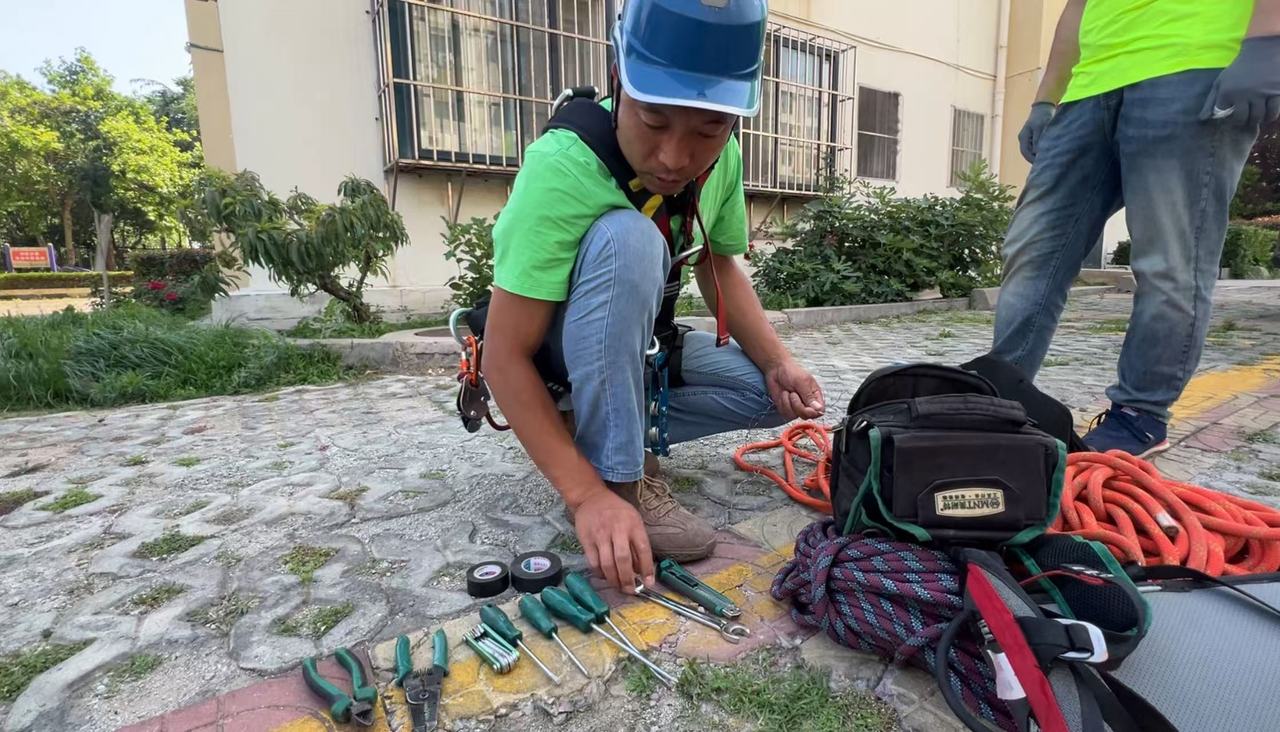 清點好裝備,連接好繩索,莊會坤跨出護欄,坐到“吊板”上把腳叉開,穩住身體,沿著12層高樓外墻緩緩下滑,固定樓體外墻脫落的燈管。