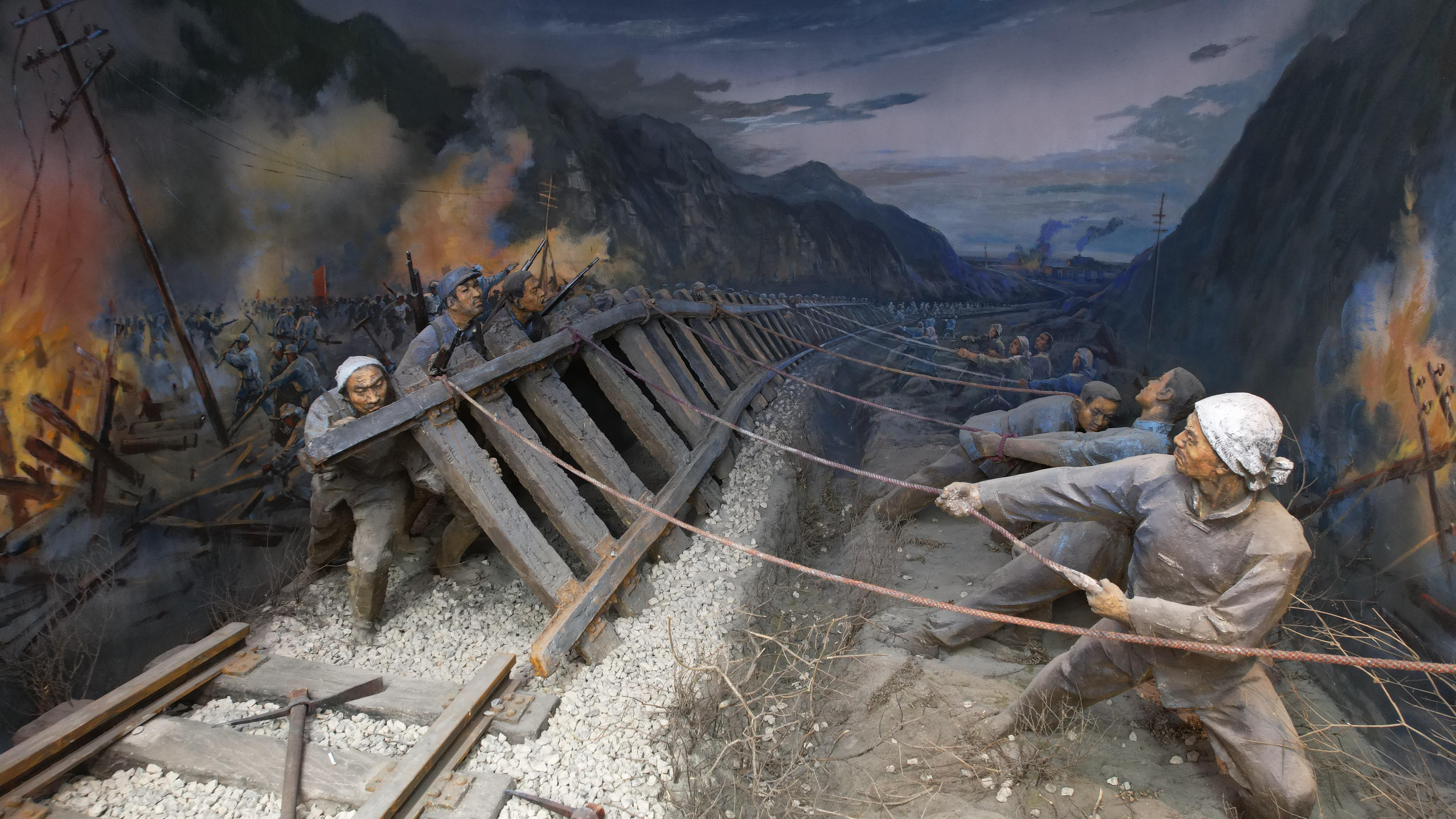 △百團大戰紀念館內展示的軍民掀翻鐵軌的場景。(總臺央視記者范凱、裴大偉拍攝)
