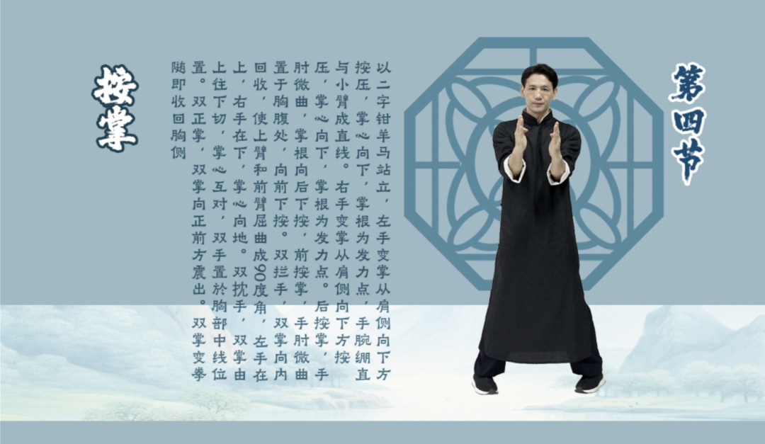 按掌是詠春拳中的一個基本手法,通過以氣催力,練習詠春拳的寸勁發力。其核心在于“按”這個動作,即手掌向下按壓。