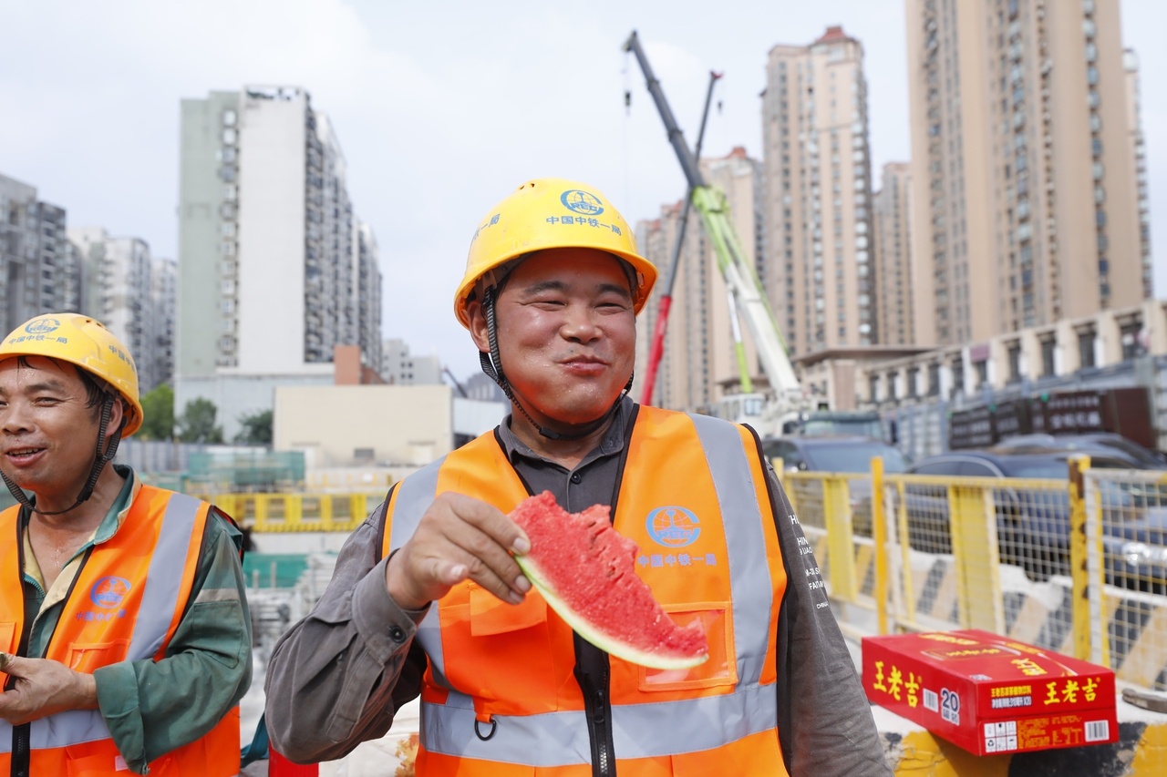 慰問組一行把飲料、西瓜、冰棍等遞到工人手中,叮囑大家:“千萬注意防暑降溫,平安健康是首位!”當慰問組了解到武漢軌道交通12號線是國內最長地鐵環線,項目建成通車后,將串聯武漢7個中心城區,與武漢18條地鐵線路26座車站實現便捷換乘后,大家紛紛豎起了大拇指,為參建這一重大地鐵工程項目的一線建設者點贊。已有30年工齡的楊榮收到清涼物資后感觸頗深,來武漢的10年間,他先后參與了武漢地鐵5條線路的施工,他十分高興地說:“現在比以前條件好了很多,下午可以等太陽快下山再開工,工地配備了很多冷飲和藥品,工作環境更舒心了?!?/p>