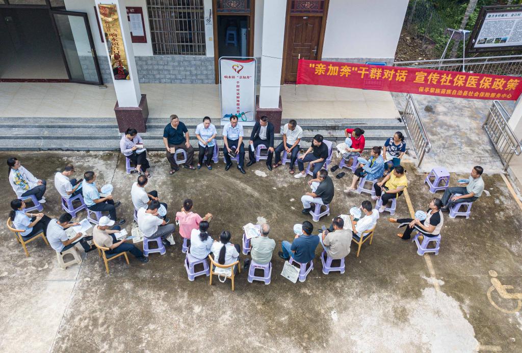 7月16日,在海南省保亭黎族苗族自治縣響水鎮合口村拍攝的“親加奔——干群對話解難題”活動現場(無人機照片)。新華社記者 蒲曉旭 攝