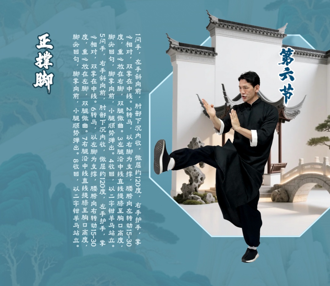 正撐腳是詠春拳中屬于正蹬類的腿法,常用于實戰中的進攻或防御。動作講究力達腳跟,配合手法,出其不意,快速隱蔽。