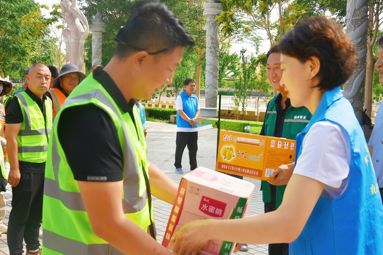 入伏以來,甘肅敦煌持續高溫,熱浪炙烤大地,敦煌市總工會全面落實甘肅省總工會“送清涼+”的工作要求,走進社區、快遞園區、交通一線、建筑工地、旅游風景區等地,為戶外和高溫環境作業的勞動者送上飲料、礦泉水、杏皮茶、西瓜及防暑降溫藥品等清涼“禮包”的同時,融入“送健康”“送便利”“送文化”的創新服務,全方位為一線勞動者送上夏日的清涼與溫暖。