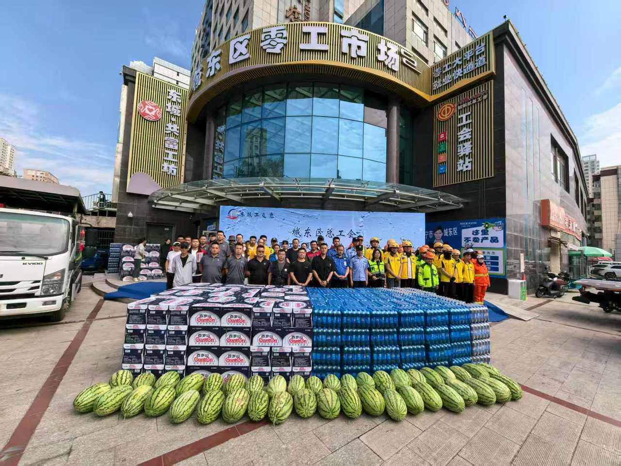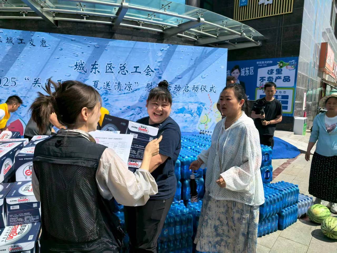 啟動儀式上,城東區總工會負責人向全區堅守崗位的一線戶外勞動者代表致以敬意,叮囑大家要注意防暑降溫,合理安排工作時間,確保自身健康和安全。隨后,工會工作人員為快遞小哥等一線戶外勞動者分發2000余箱解暑飲料、2萬多斤新鮮西瓜等價值近20萬元的清涼物資,沉甸甸的送清涼物資承載著城東區工會“娘家人”的貼心關懷,讓全區一線戶外勞動者在炎炎夏日中倍感清涼。
