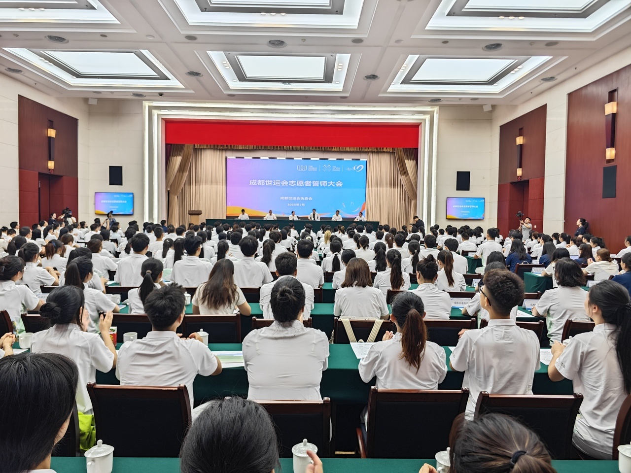 大會向全體“小青椒”志愿者發(fā)出動員令,勉勵志愿者牢記囑托,立足崗位,以燦爛的笑容、嚴(yán)謹(jǐn)?shù)膽B(tài)度、昂揚(yáng)的風(fēng)采,讓來自世界各地的體育健兒在奮力參賽的同時,感受到成都這座城市的熱情和溫度。