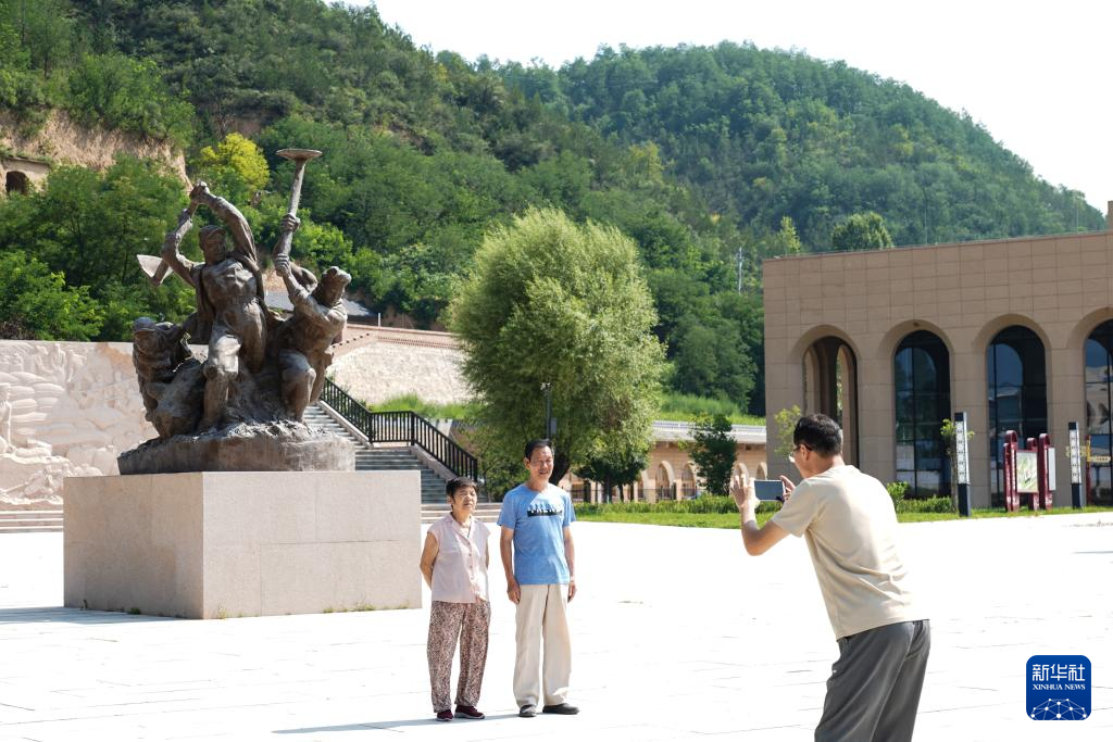 游客在南泥灣大生產紀念廣場的雕塑前合影(7月29日攝)。新華社記者 樊雨晴 攝