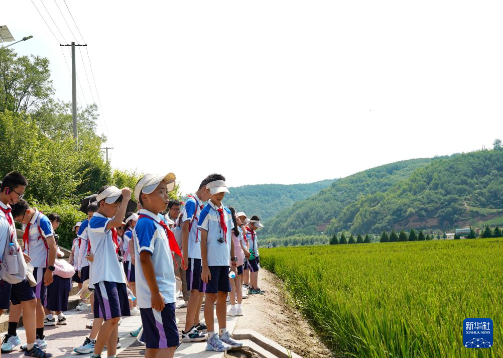 小學生研學團在南泥灣千畝稻田景觀前駐足觀賞(7月29日攝)。新華社記者 樊雨晴 攝