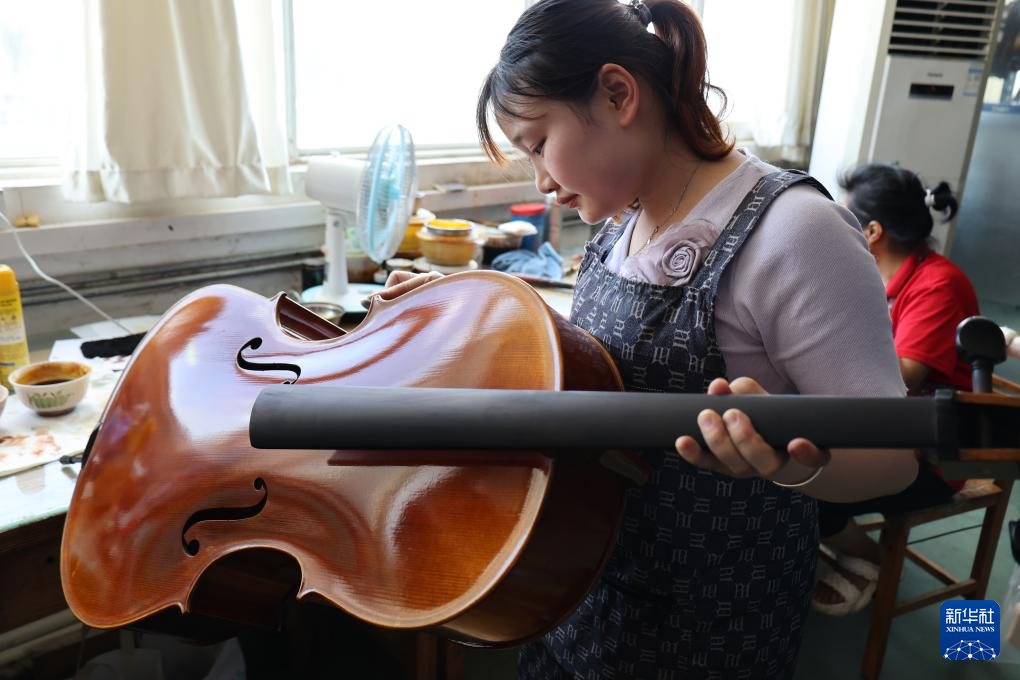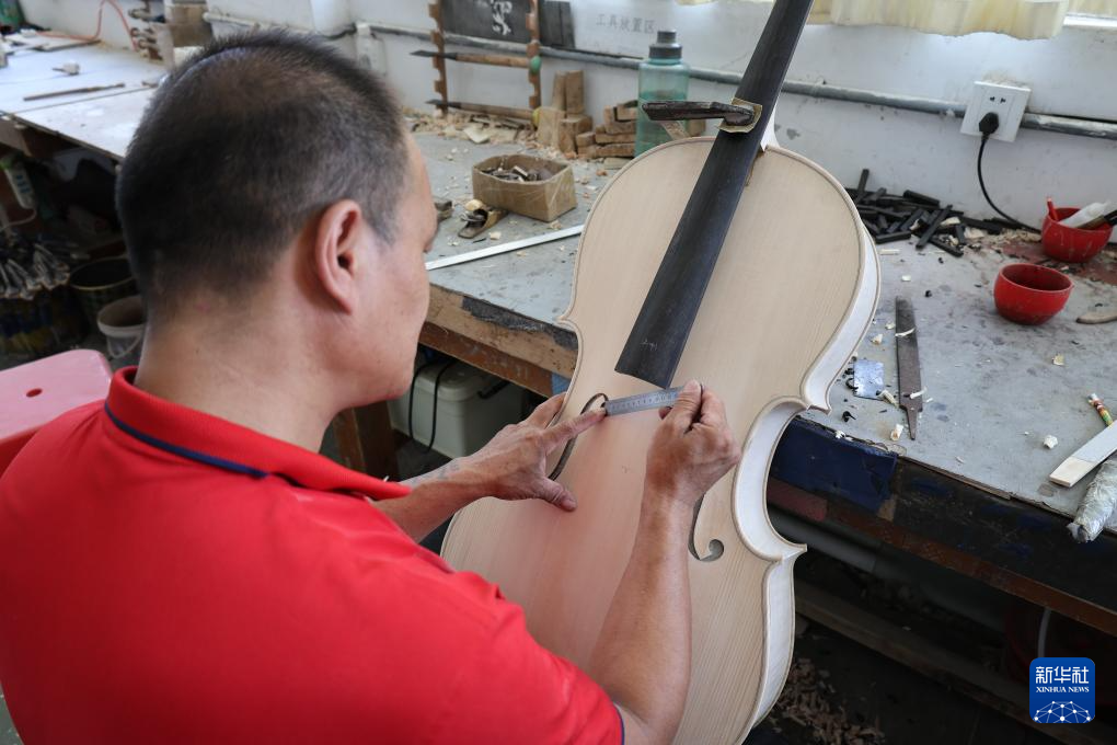 7月24日,在河南省駐馬店市確山縣的確山提琴產業園,一名工人在一家企業的工作室內制作提琴。新華社記者 朱唯希 攝