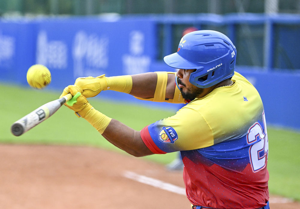 8月6日,委內瑞拉隊球員迪亞斯在比賽中擊球。新華社記者馮開華 攝