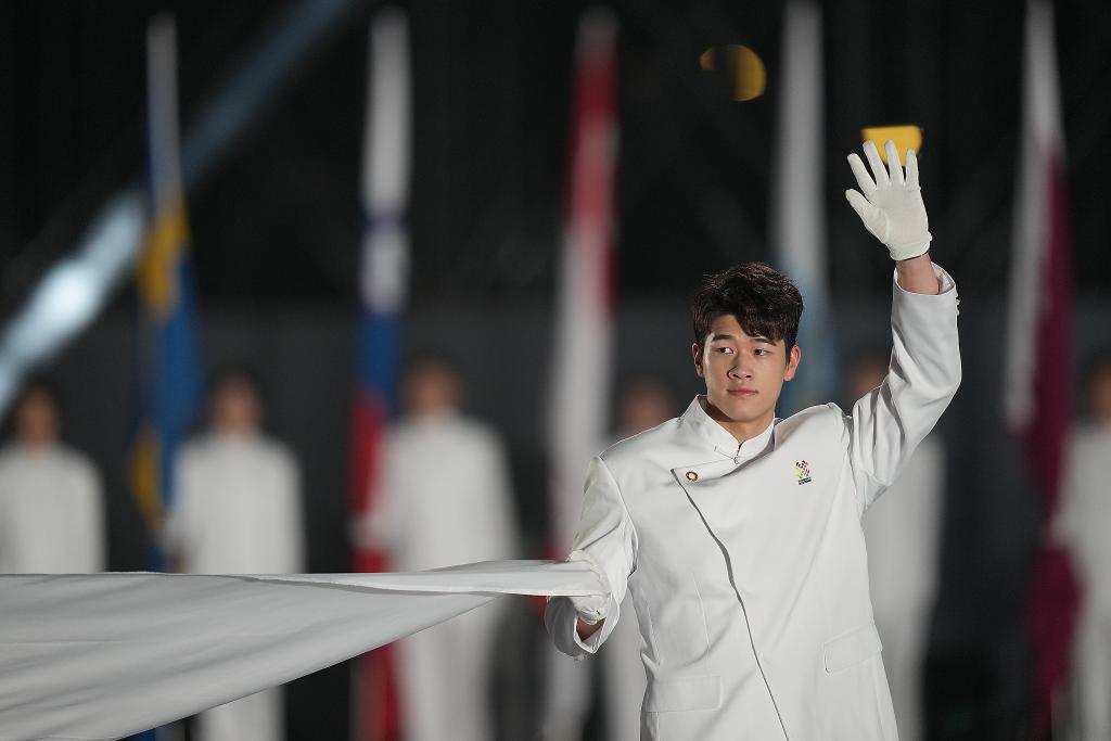 8月7日,國際奧林匹克委員會會旗執旗手潘展樂在開幕式上。新華社記者 劉坤 攝