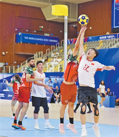 中國(guó)隊(duì)球員與葡萄牙隊(duì)球員在荷球混合團(tuán)體比賽中。人民日?qǐng)?bào)記者 蔣雨師 攝