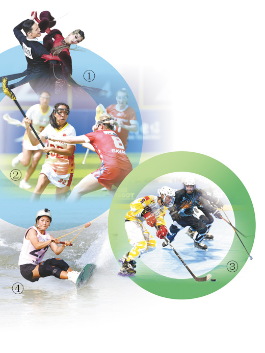 圖①:中國隊(duì)組合周忻凝(右)/譚然在體育舞蹈標(biāo)準(zhǔn)舞半決賽中。新華社記者 杜子璇攝 圖②:中國隊(duì)球員姚賽東(左)在棍網(wǎng)球女子組比賽中。人民日報(bào)記者 陶相安攝 圖③:中國隊(duì)與阿根廷隊(duì)在單排輪滑球男子決賽第七名爭奪賽中。新華社記者 謝劍飛攝 圖④:中國隊(duì)選手徐露在女子索道滑水預(yù)賽中。人民日報(bào)記者 蔣雨師攝
