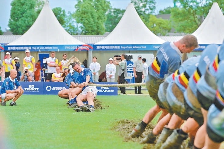 世運會拔河比賽上,意大利隊與比利時隊在室外天然草皮上展開對決。北京日報特派記者 金瑤攝