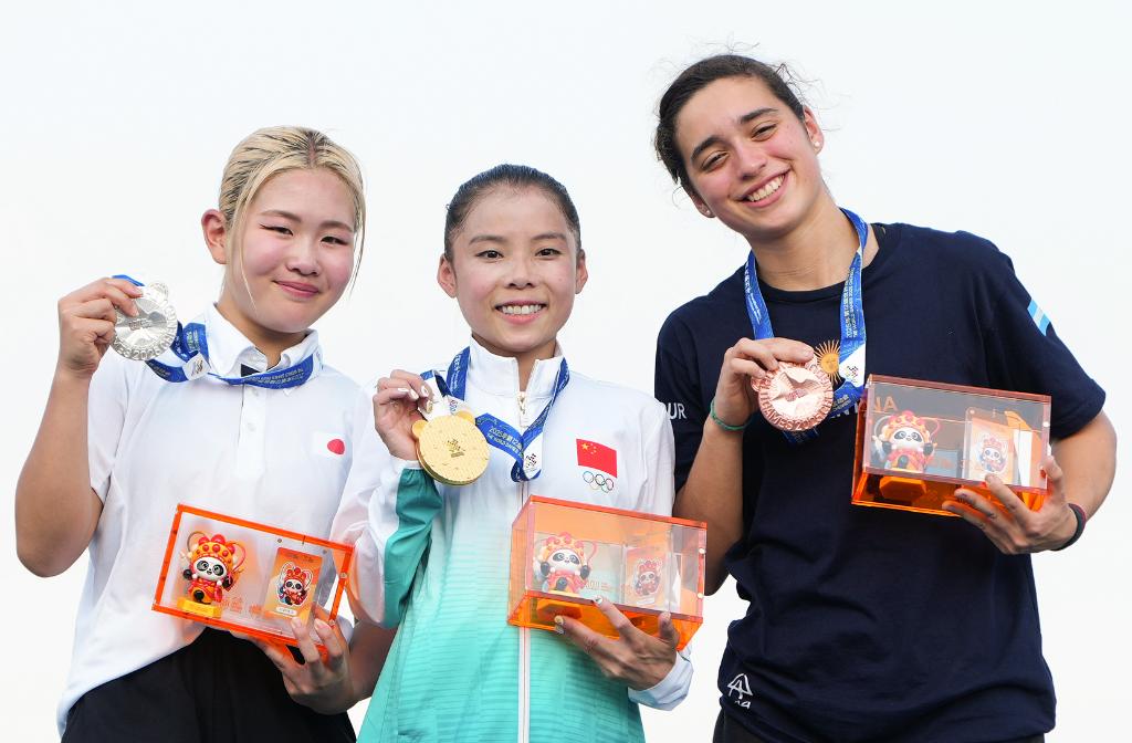 8月13日,冠軍中國選手商春松(中)、亞軍日本選手永井音寧(左)、季軍阿根廷選手薩拉在頒獎儀式上合影。新華社記者 李嘉南 攝