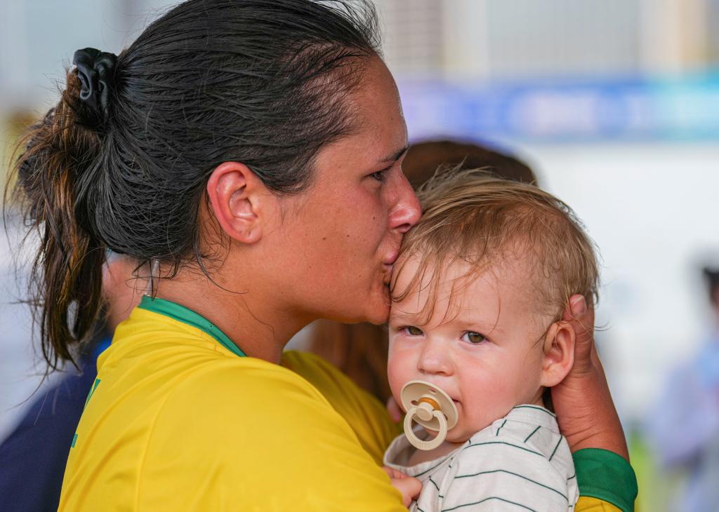 8月13日,巴西隊球員薩弗特在比賽后親吻自己的孩子。新華社記者 丁增尼達 攝