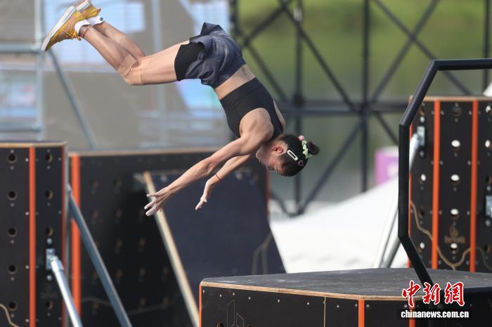8月13日,在2025年成都世運會跑酷女子自由式決賽中,中國選手商春松奪得冠軍。圖為商春松在比賽中。中新社記者 張浪 攝