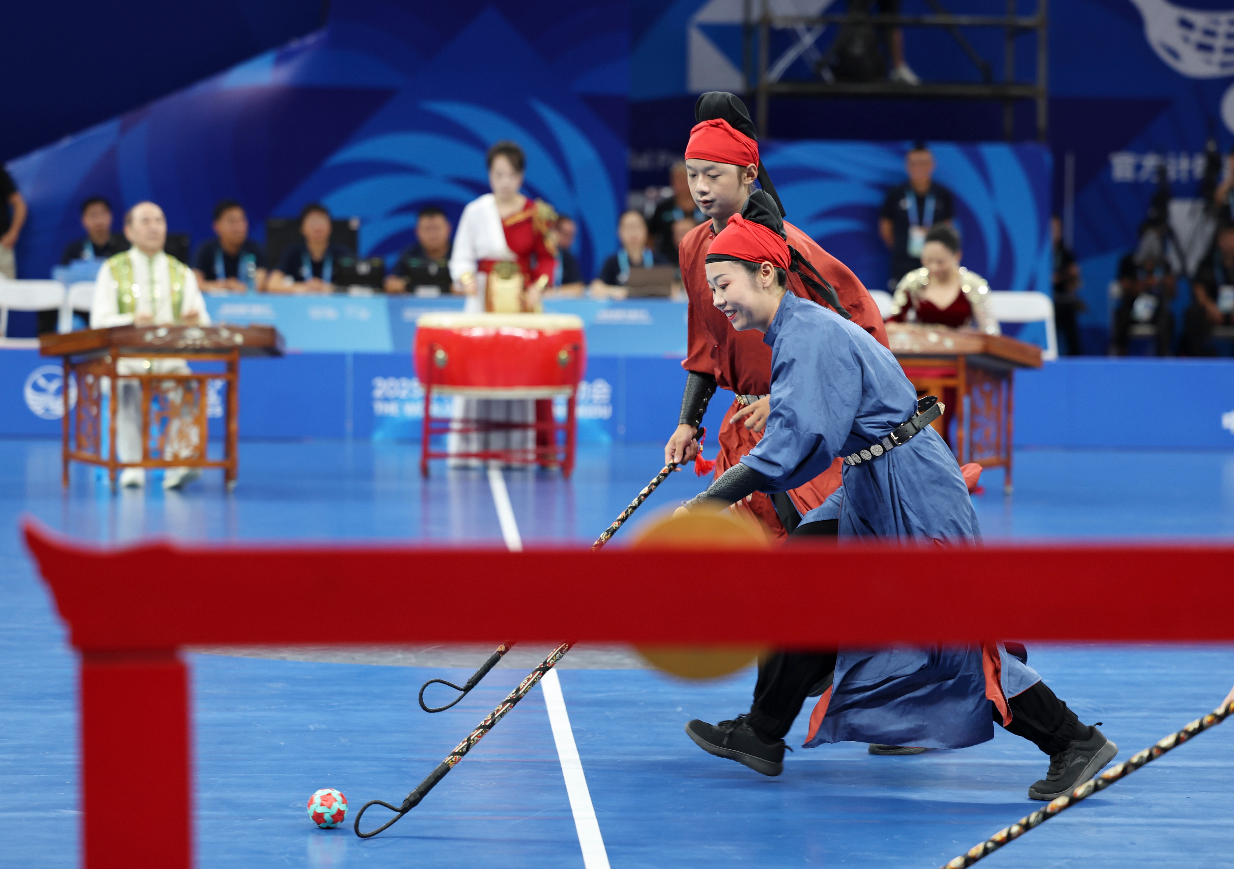 世運會不僅是競技的賽場,更是文明互鑒的窗口。8月6日,軟式曲棍球項目開賽。正式比賽之前,一場別開生面的“比賽”率先上演。循著鼓點、琴聲,演員們身著唐裝球衣競逐竹編彩球,一場金堂非遺步打球表演,將現場觀眾帶回到盛唐場景。