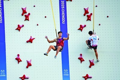 光明日報成都8月15日電(記者王東)成都世運會15日進入倒數第三個比賽日,各路選手進行了15枚金牌的爭奪。中國選手向健美操、地擲球和攀巖項目的金牌發起沖擊,龍見國獲得攀巖男子速度個人四條道金牌,范思偉、馮蕾、梁文杰、滕浩、許彤獲得健美操五人操冠軍。
