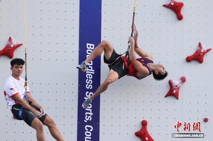8月15日,2025年成都世運會攀巖男子速度個人四條道決賽在成都天府公園舉行,中國選手龍見國以4秒74奪冠。圖為龍見國(右)完成比賽。中新社記者 張浪 攝