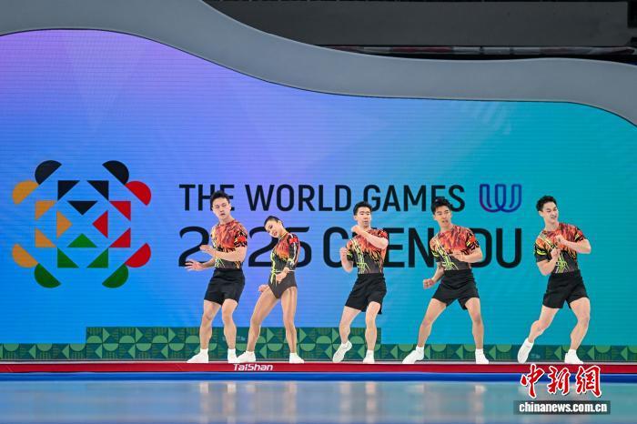 8月15日,在2025年成都世運會健美操五人操決賽中,中國隊獲冠軍。圖為中國隊在比賽中。中新社記者 劉忠俊 攝