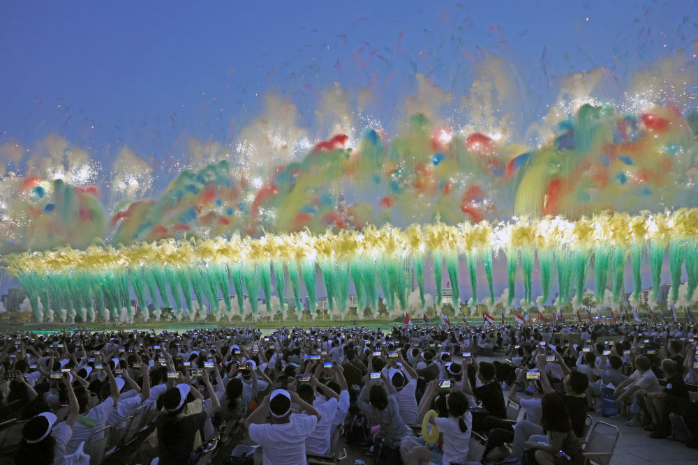 8月7日,觀眾在開幕式上用手機拍攝焰火表演。新華社記者 陳斌 攝