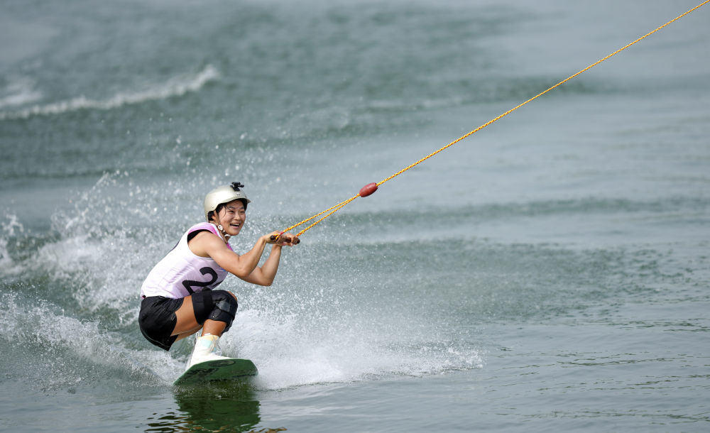 8月8日,2025年成都世運會索道滑水資格賽在三岔湖桃花島賽場舉行,圖為中國選手徐露在女子資格賽中。新華社記者 貝赫 攝