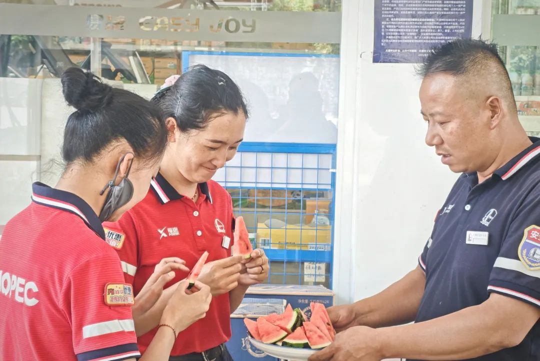 臨滄石油鎮康城北加能站經理段家昌為站內員工制作消暑甜品“涼蝦”。“炎炎夏日能吃到這樣一碗涼蝦,很滿足!”笑聲中,暑意消散,堅守的疲憊化作暖心的力量。大理石油工會開展“夏日送清涼”暖心活動,組織加能站經理化身“清涼使者”,將冰鎮西瓜送到庫站一線員工手中,用貼心舉動為員工驅散暑氣。