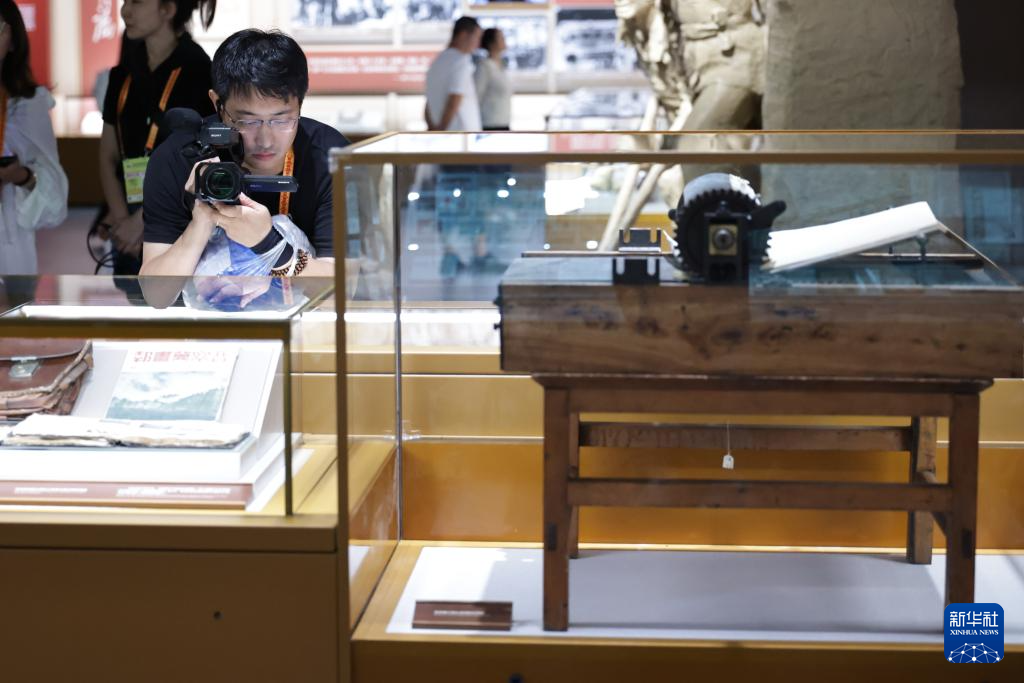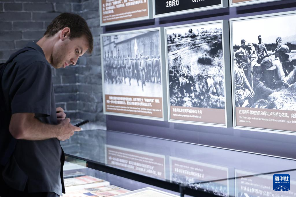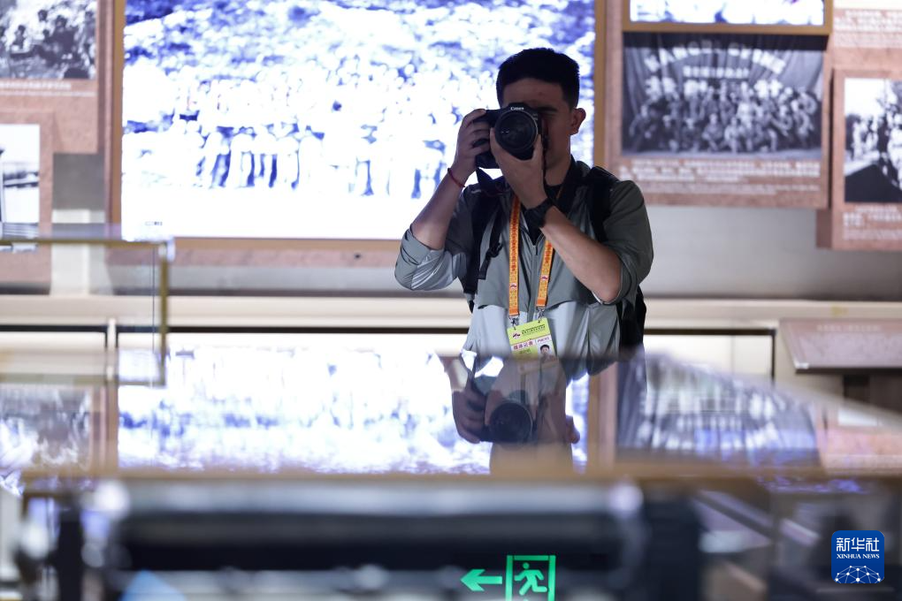 8月27日,一名記者在中國人民抗日戰爭紀念館內采訪。新華社記者 張玉薇 攝