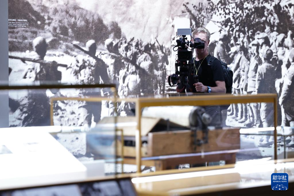 8月27日,中外媒體記者在中國人民抗日戰爭紀念館內采訪。新華社記者 張玉薇 攝