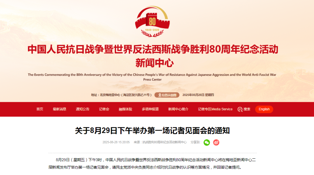 8月29日(星期五)下午3時,中國人民抗日戰爭暨世界反法西斯戰爭勝利80周年紀念活動新聞中心將在梅地亞新聞中心二層新聞發布廳舉辦第一場記者見面會,請民主黨派中央負責同志介紹對抗日戰爭的認識等方面情況,并回答記者提問。(記者 范思翔)