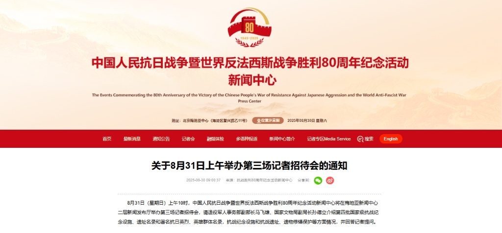 8月31日(星期日)上午10時,中國人民抗日戰爭暨世界反法西斯戰爭勝利80周年紀念活動新聞中心將在梅地亞新聞中心二層新聞發布廳舉辦第三場記者招待會,請退役軍人事務部副部長馬飛雄、國家文物局副局長孫德立介紹第四批國家級抗戰紀念設施、遺址名錄和著名抗日英烈、英雄群體名錄,抗戰紀念設施和抗戰遺址、遺物修繕保護等方面情況,并回答記者提問。(記者朱高祥)