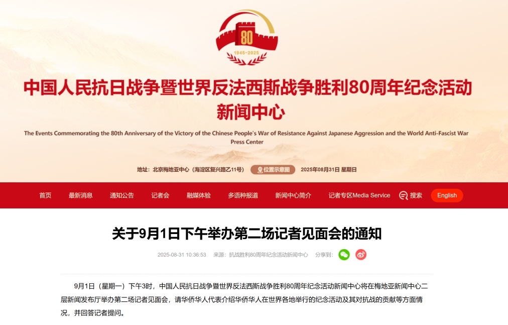 9月1日(星期一)下午3時,中國人民抗日戰爭暨世界反法西斯戰爭勝利80周年紀念活動新聞中心將在梅地亞新聞中心二層新聞發布廳舉辦第二場記者見面會,請華僑華人代表介紹華僑華人在世界各地舉行的紀念活動及其對抗戰的貢獻等方面情況,并回答記者提問。(記者范思翔)