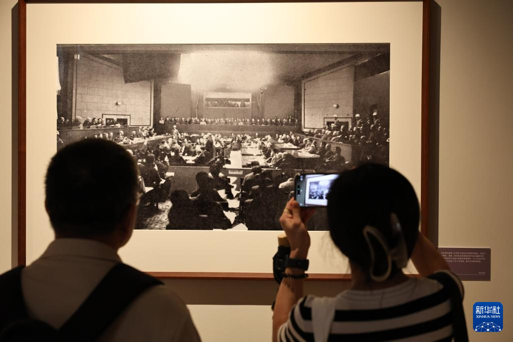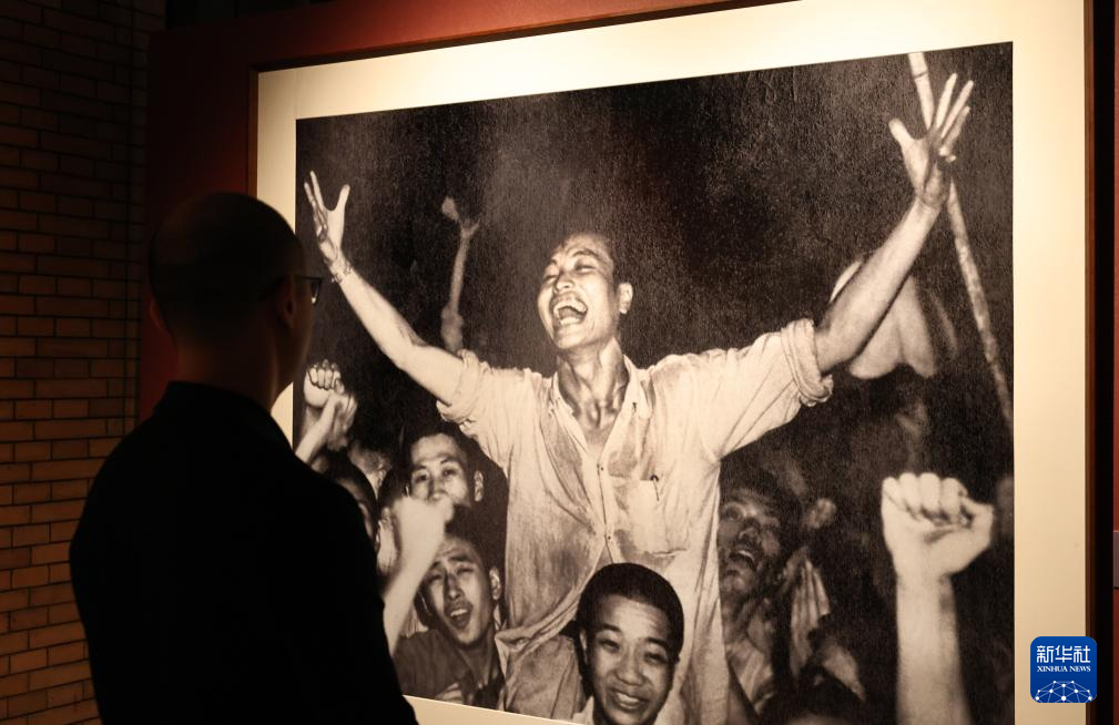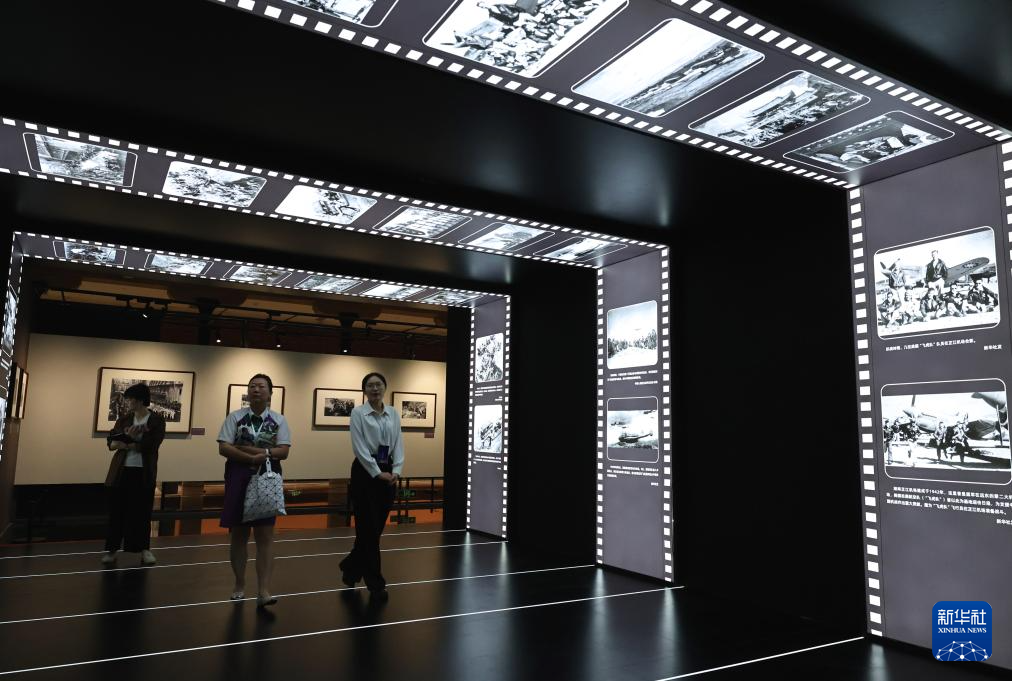 9月1日,參觀者在藝術展上展出的抗戰主題攝影作品前駐足觀看。新華社記者 方喆 攝