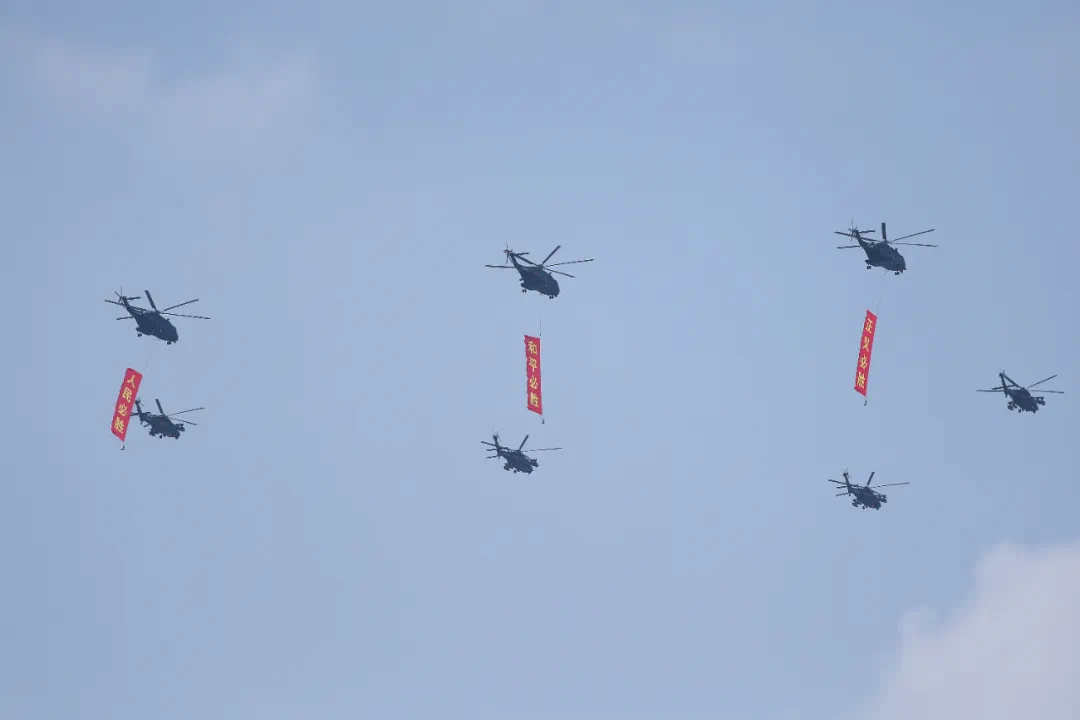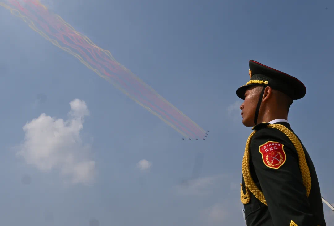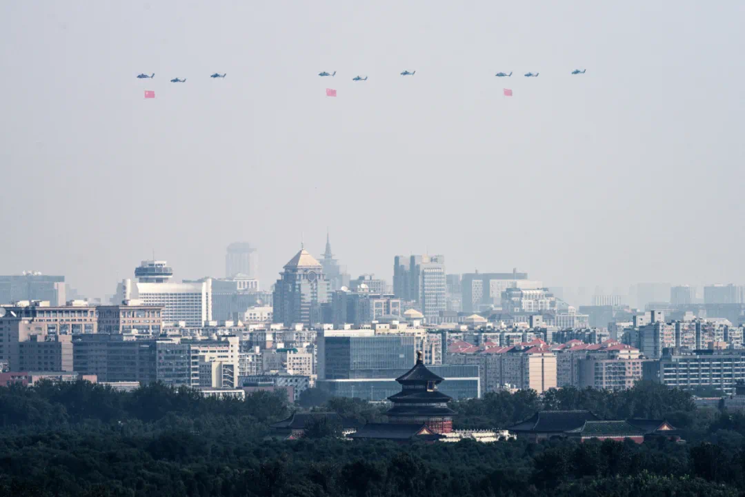 9月3日,紀念中國人民抗日戰爭暨世界反法西斯戰爭勝利80周年大會在北京隆重舉行。這是空中護旗梯隊接受檢閱。新華社記者 張笑宇 攝