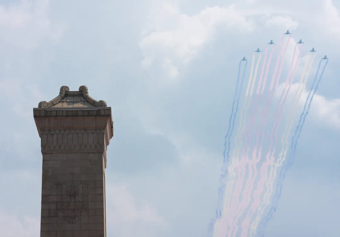 9月3日,紀念中國人民抗日戰爭暨世界反法西斯戰爭勝利80周年大會在北京隆重舉行。這是在北京天壇公園拍攝的教練機梯隊。新華社記者 趙子碩 攝