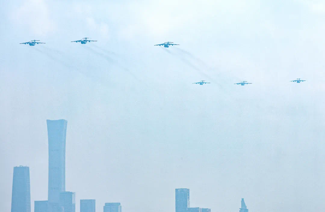 9月3日,紀念中國人民抗日戰爭暨世界反法西斯戰爭勝利80周年大會在北京隆重舉行。這是運輸機梯隊接受檢閱。新華社記者 孫凡越 攝