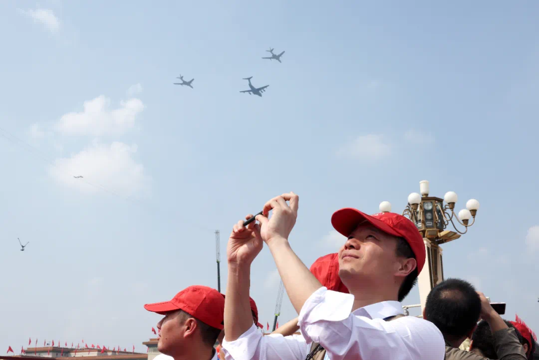 9月3日,紀念中國人民抗日戰爭暨世界反法西斯戰爭勝利80周年大會在北京隆重舉行。這是市民在觀看空中梯隊。新華社記者 陳浩明 攝