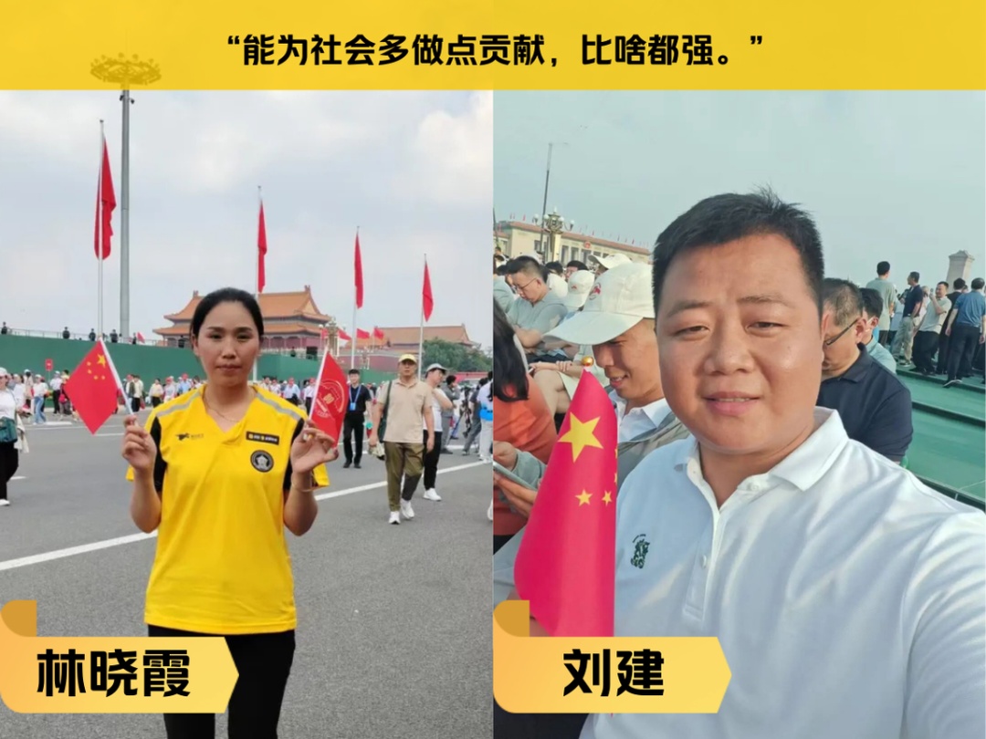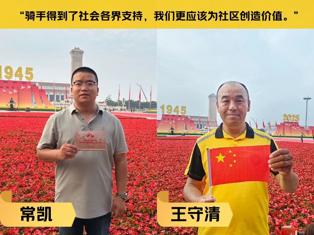 今天,來自全國各地的16名美團騎手受邀參加觀禮,共同參與見證這一光榮時刻。他們之中,既有曾經參與小興安嶺滅火、松花江抗洪的退伍老兵,也有在車禍中救援受困司機的先鋒騎手。