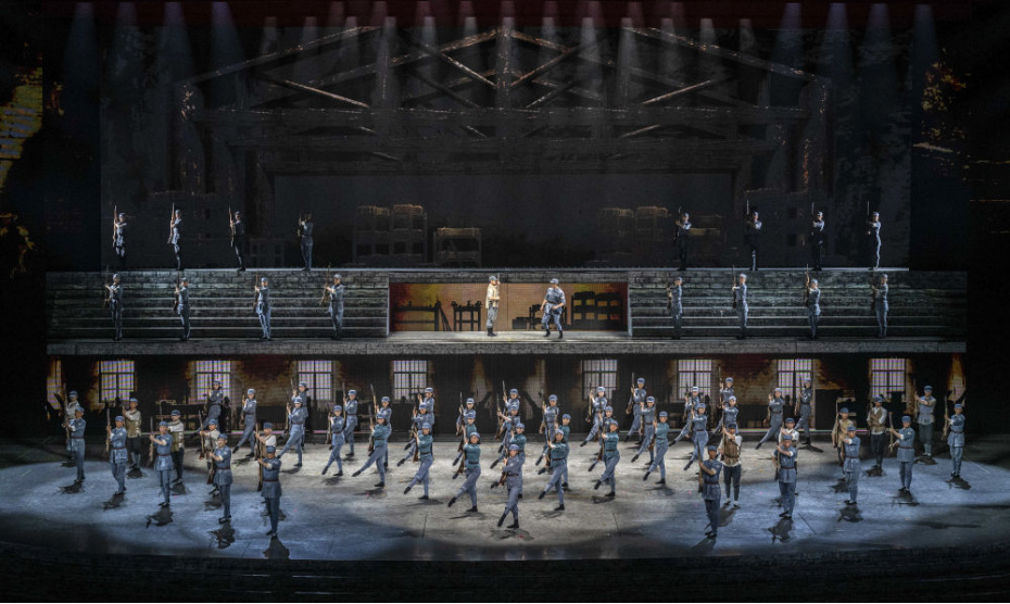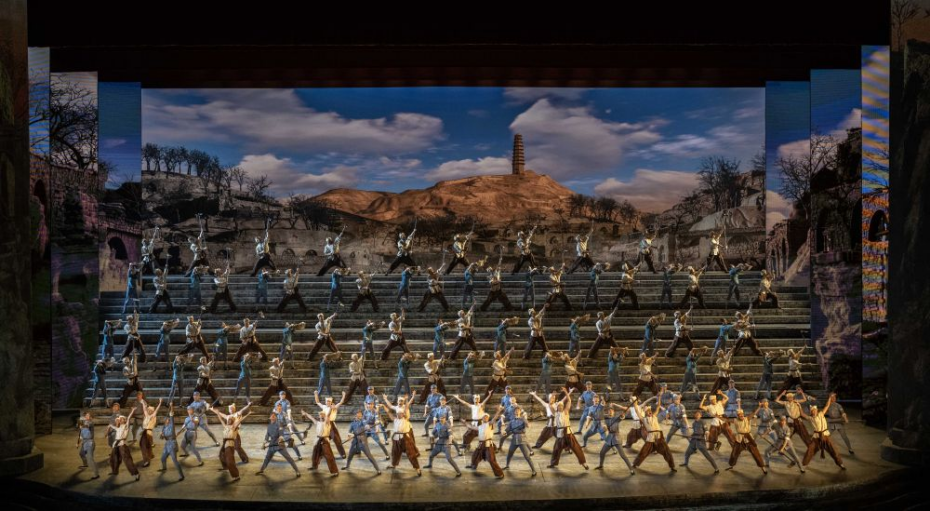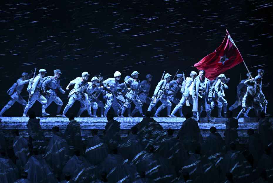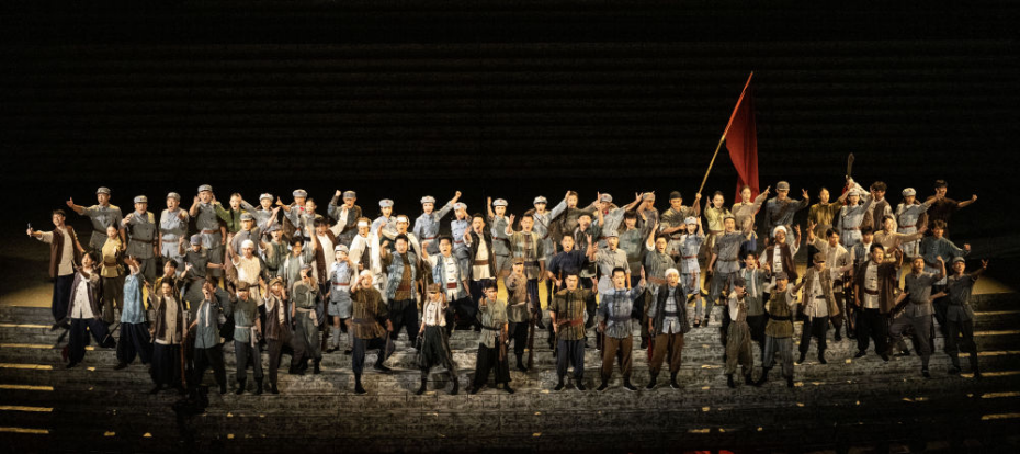 這是晚會開始前,前來觀看演出的抗戰(zhàn)老戰(zhàn)士老同志代表來到大禮堂觀眾席就座,全場起立報以熱烈掌聲。