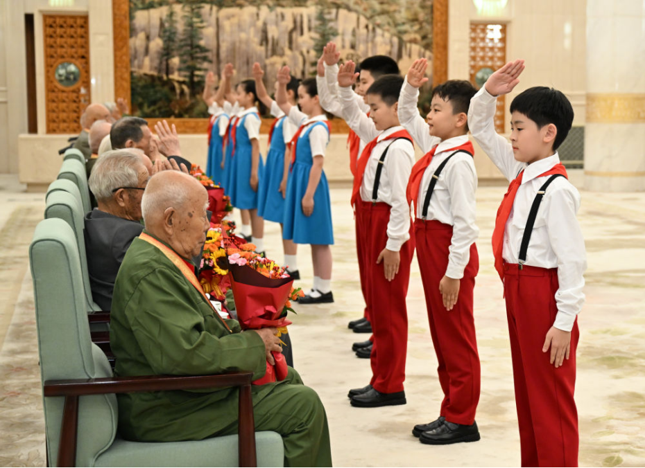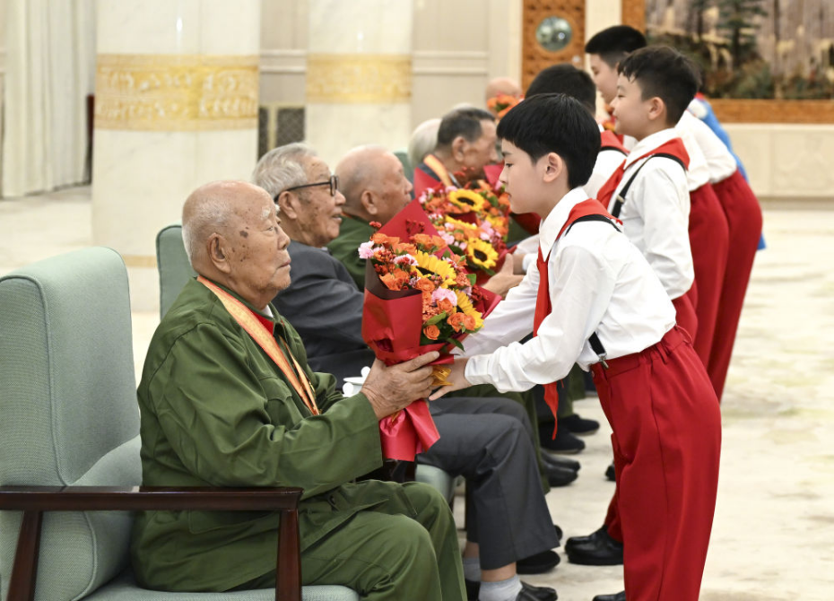 這是晚會開始前,少先隊員向前來觀看演出的抗戰(zhàn)老戰(zhàn)士老同志代表獻(xiàn)花。