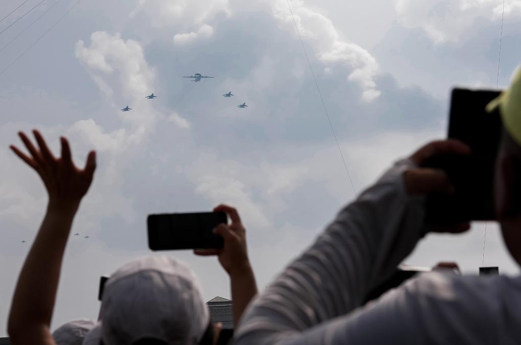 戰鷹呼嘯,振翅長空,空中梯隊依次低空飛過天安門廣場。