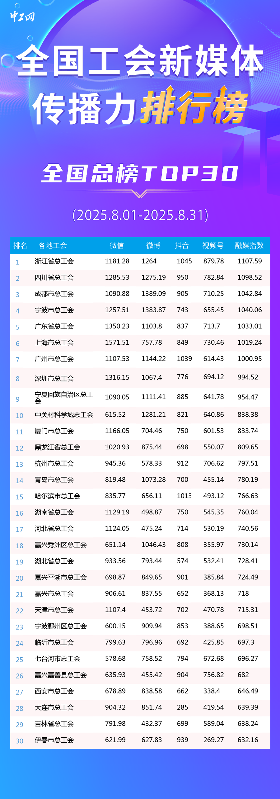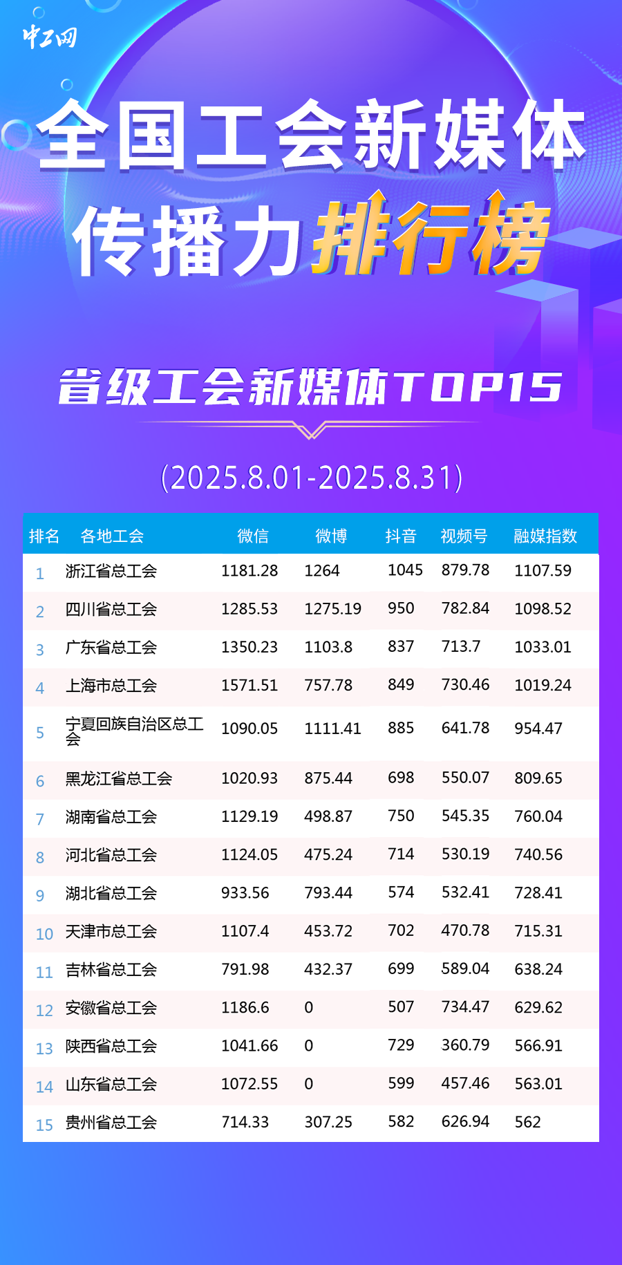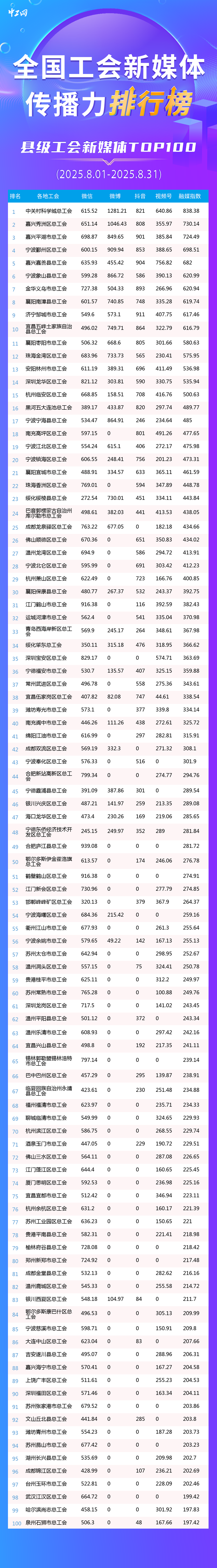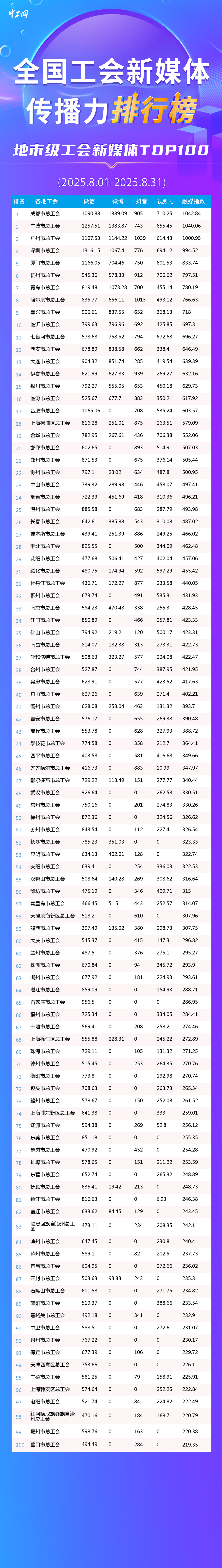8月全國(guó)工會(huì)新媒體傳播力排行榜